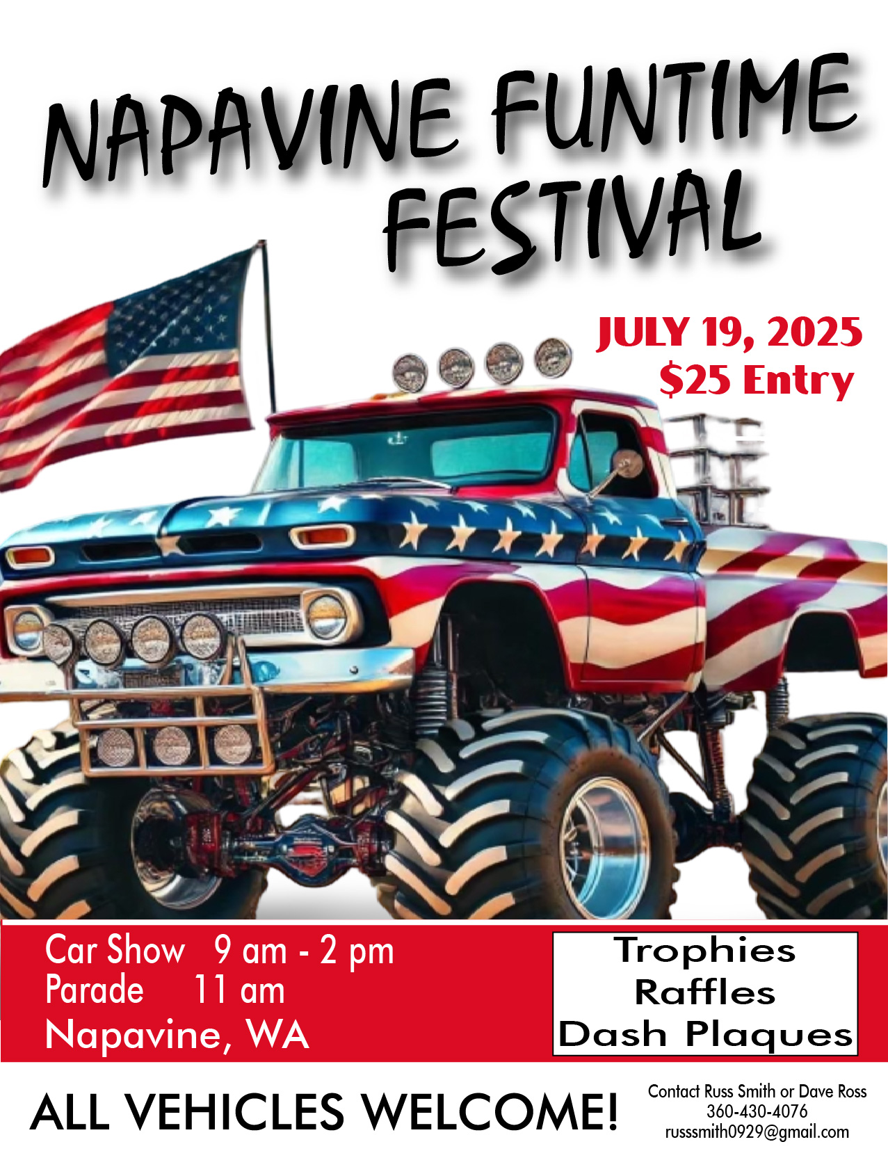 Join us July 19th for the 51st annual Napavine Funtime Festival. Download the form below to join us either as a Vendor or A Participent.